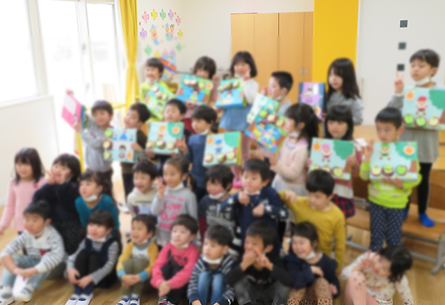 2月3日、節分だ!豆をまくぞー! 元気に準備をしてホールに集まりました。自分たちで作った豆入れやお面をお披露目して、豆まきの由来のパネルシアターを見ました。しかし・・・いざ鬼が来ると、さっきまで強がっていた子も「こわーい!」と逃げ回っていました。