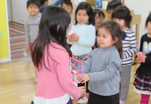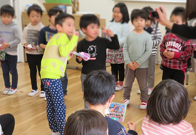 3月13日(金)、在園児で卒園児を送る会を予定していました。しかし、コロナウィルス感染予防のため、全クラス一同に集まるイベントではなく、各クラスごとにプレゼントとお祝いの言葉を届けに行くことになりました。短時間での行事となりましたが、思い出深い交流となりました。